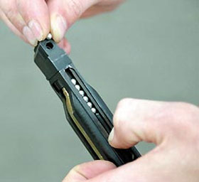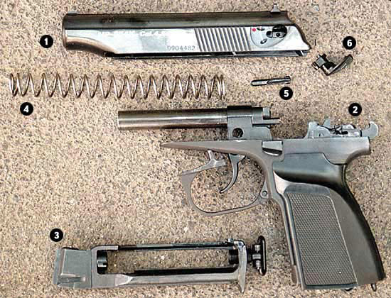 Башмак (нижняя часть) магазина имеет отверстие с резьбой, для винта. Винт может быть с антабкой, но владельцы этих пистолетов ставят потайной, якобы он больше становится похожим на настоящий. Номер на башмаке магазина соответствует номерам на затворе и раме.