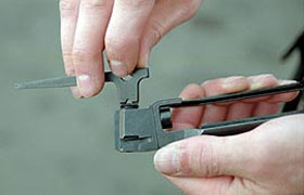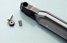 Предохранители на МР-654к ставят от ПММ, это касается всех пистолетов, кроме серии под номером 32. Предохранители взаимозаменяемы. Затворная задержка пластинчатая, в редких случаях изготовитель ставит дутые задержки, снятые с боевых пистолетов. Дутые задержки затвора ставят преимущественно на пистолеты 32-й серии.