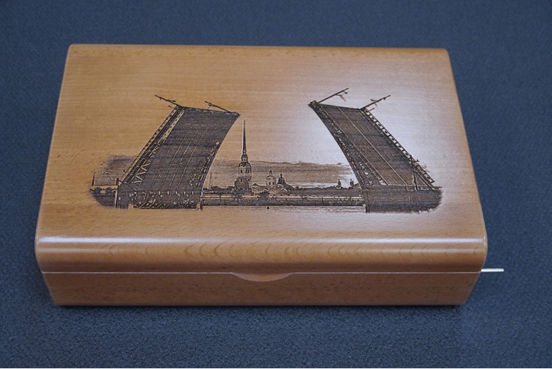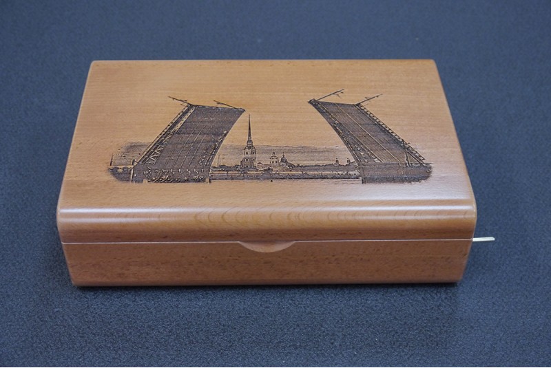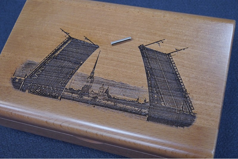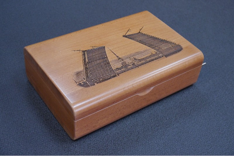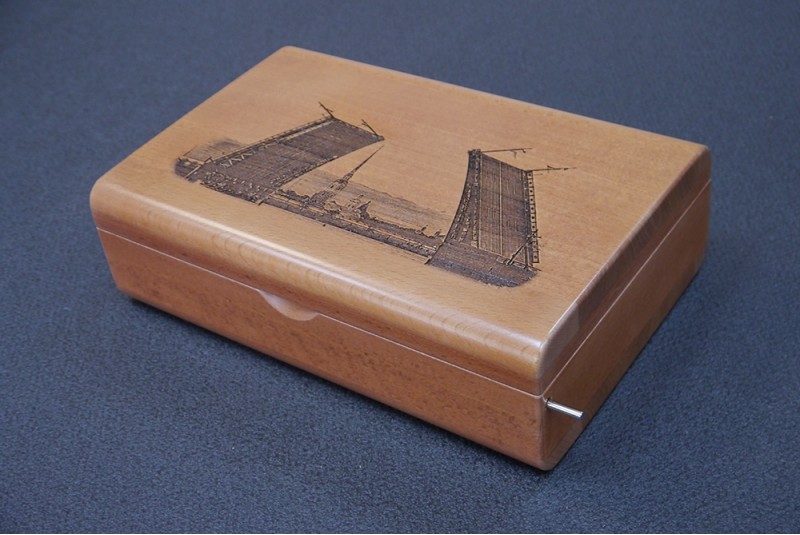 Шкатулка подарочная к пистолету с секретным магнитным замком, дерево - бук лакированый. Гравировка - Дворцовый мост.
