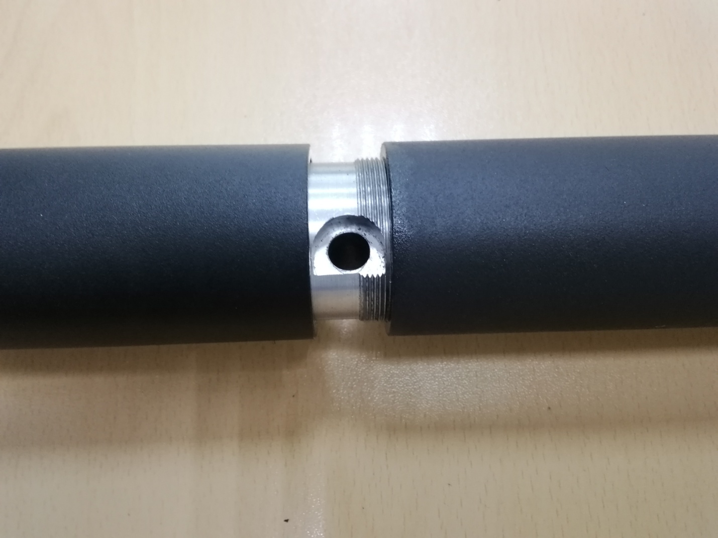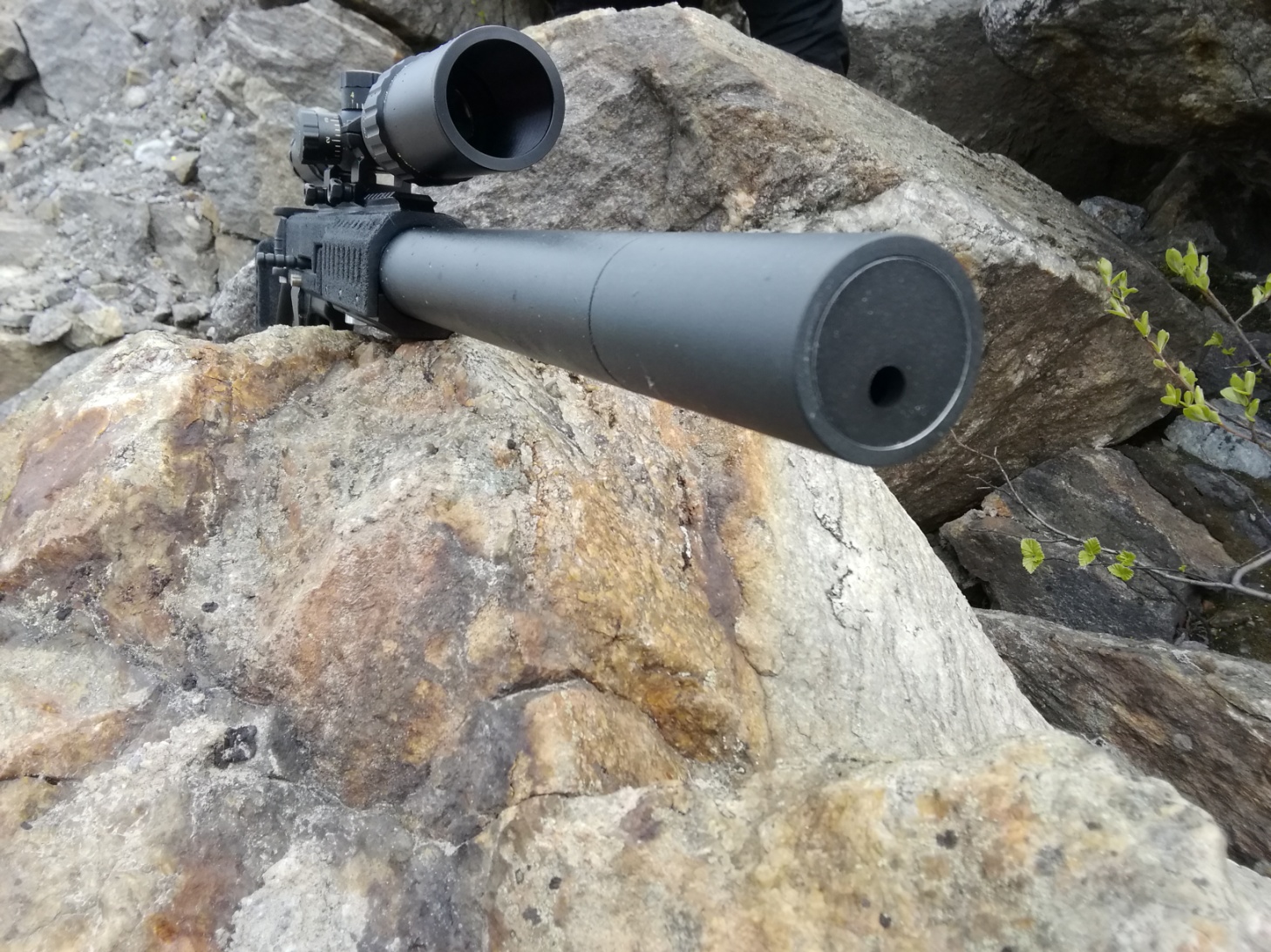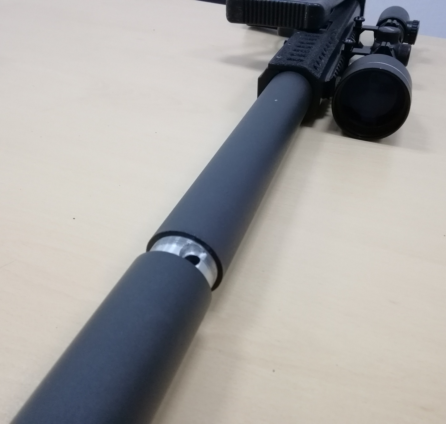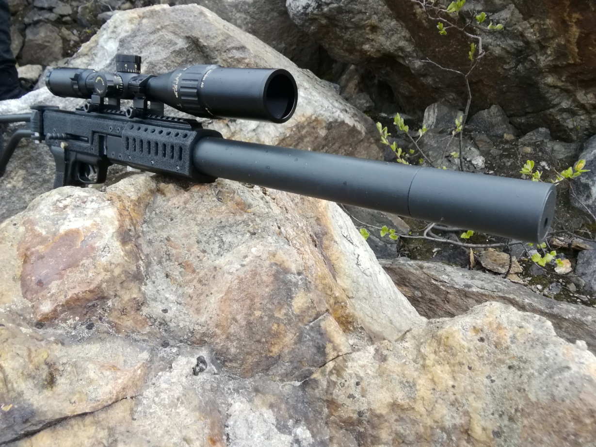 Наша винтовка в силу конструкции имеет низкий уровень шума, что делает её удобной для применения на закрытых стрелковых площадках, в тирах. Стрелять из неё можно без специальных звукоизолирующих наушников, но для ещё большего уменьшения звука выстрела, мы предлагаем (опция) саунд-модератор состоящий из 2-хкамер (длина 90 мм) устанавливаемый и закрепляемый на винтовке на дульном срезе.