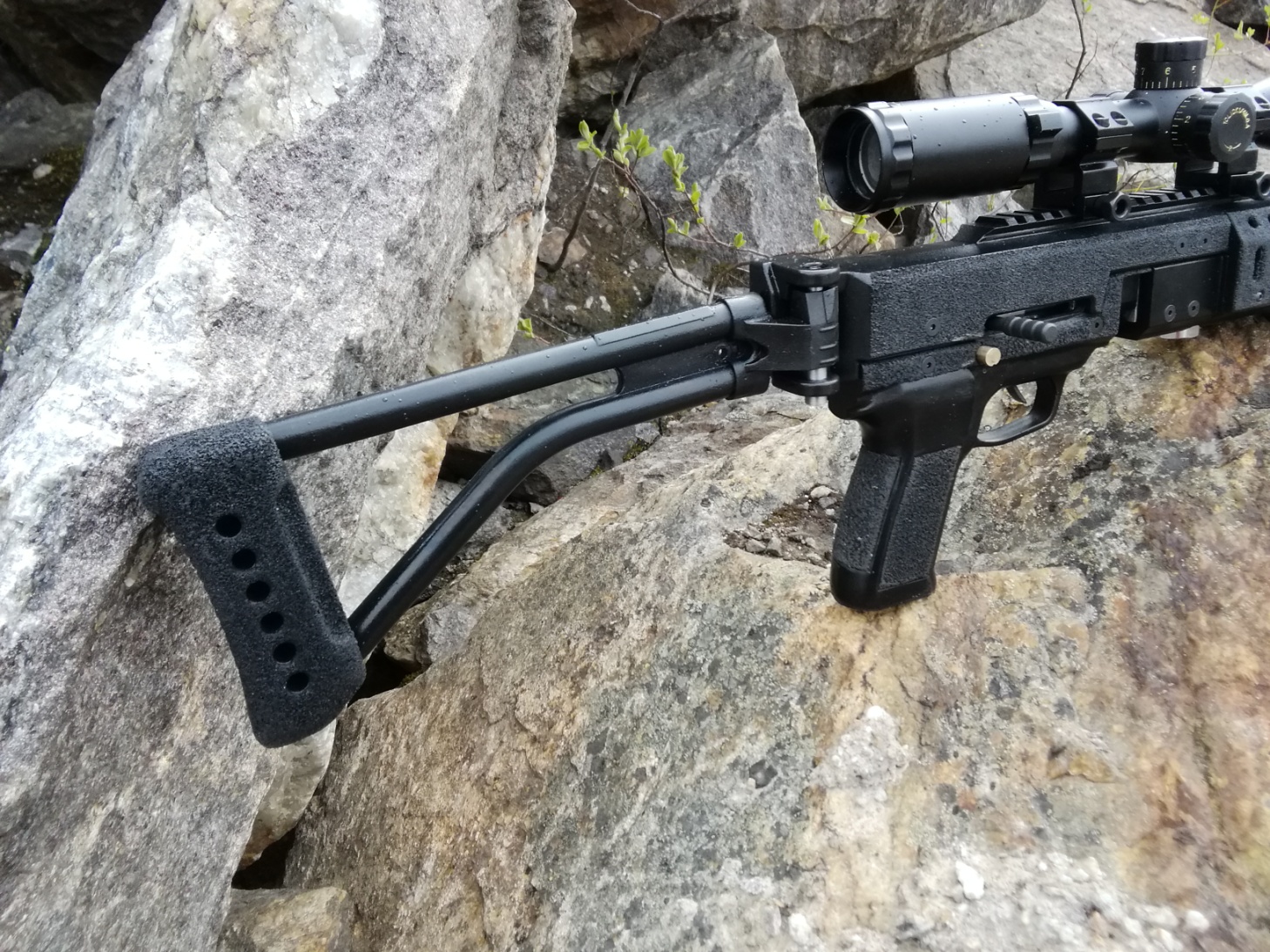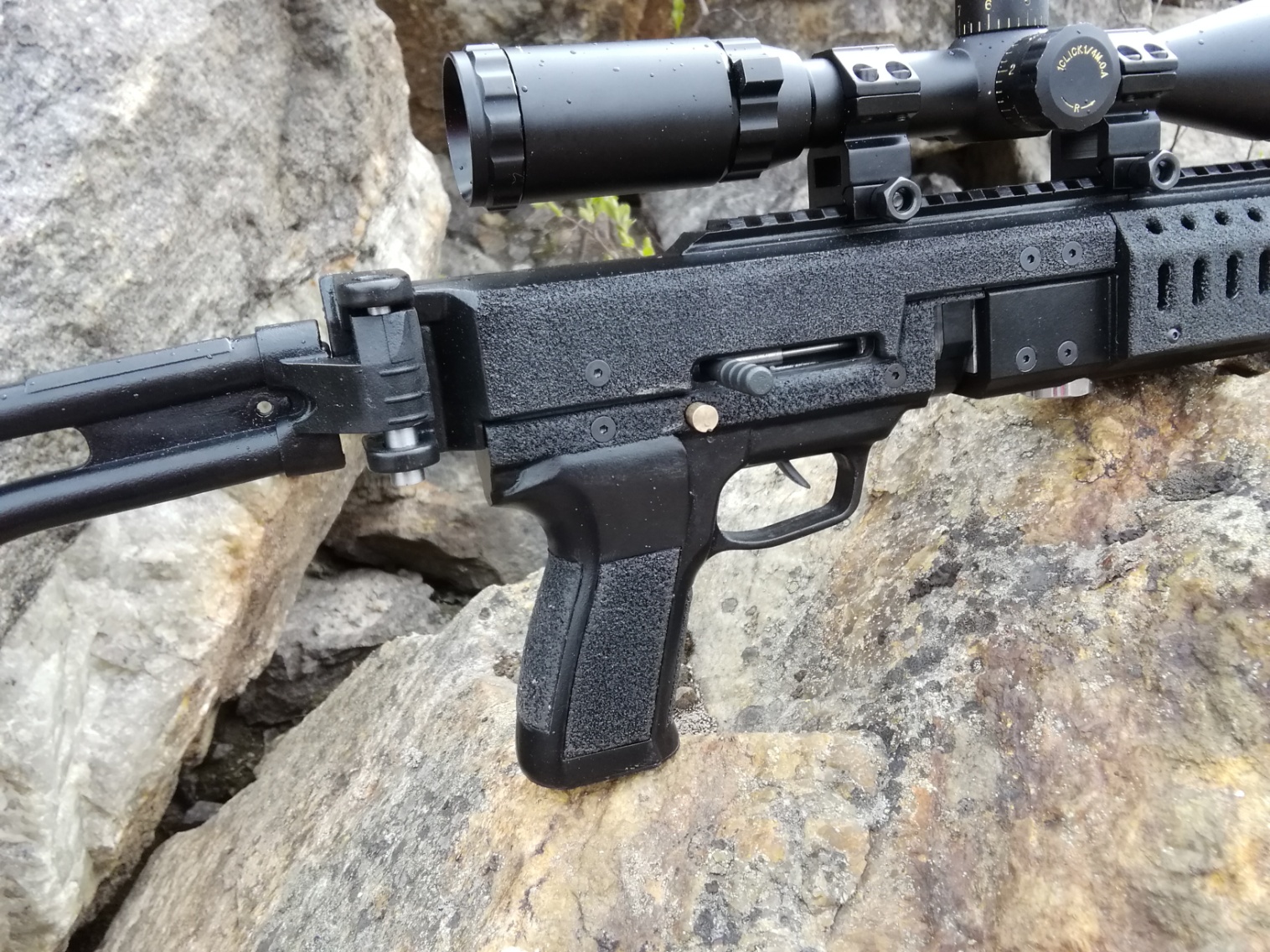 Винтовка выполнена в классическом стиле, с прикладом, который складывается вдоль ствольной коробки на правую сторону.